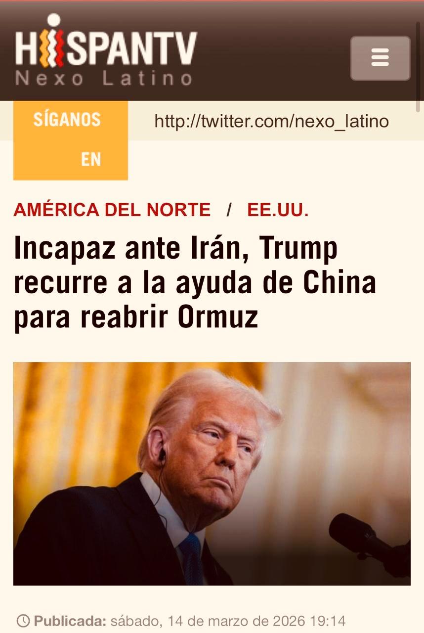 O portal de notícias iraniano “HispanTV”, voltado para as nações de língua espanhola, publicou nesse sábado (14/03) um importante artigo intitulado: “Incapaz diante do Irã, Trump recorre a ajuda da China para reabrir o Ormuz” em que afirma “Diante da incapacidade das Forças Armadas dos EUA de reabrir o Estreito de Ormuz, Trump recorreu à […]