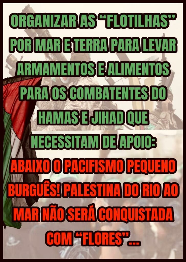Desgraçadamente enquanto a exquerda burguesa organizou midiáticas as “Flotilhas do Amor a Gaza” omitiu completamente a solidariedade política e material ao Hamas e Jihad Islâmica, organizações dirigentes da luta armada para derrotar os genocidas sionistas que foram brutalmente atacadas nesse momento em Gaza junto com a população civil!