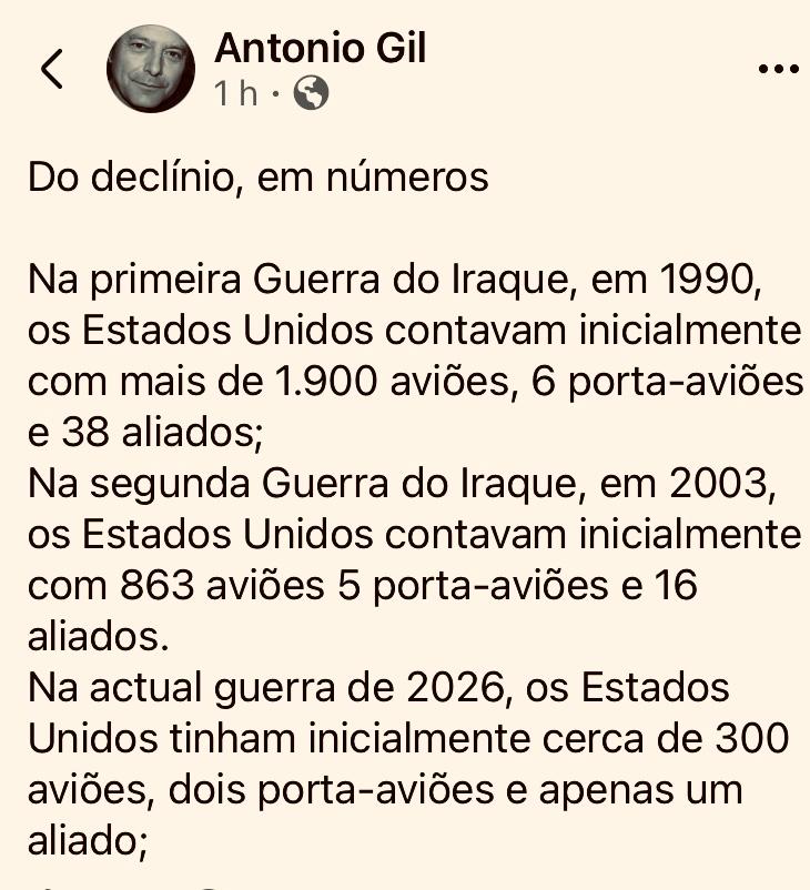 “Não se engane Gil, o poderio bélico dos EUA é mais letal agora! Porém o mais importante e crucial para a vitória do Irã seria o suporte militar da Rússia, que desgraçadamente não virá por covardia de Putin. Essa lenda de que a ‘civilização persa de 2.500 anos poderá derrotar sozinha o imperialismo ianque’, representa distracionismo criminoso de uma exquerda reformista que pretende encobrir o papel submisso da Rússia e China diante da Casa Branca. Se o Irã cair o próximo será a Rússia em no máximo 2 anos! Obviamente a China será o ‘adversário’ ideal dos EUA para enganar os tolos. Não irá intervir para defender a Rússia, assim como faz com o seu parceiro persa, mais além de declarações diplomáticas inúteis. Após este cenário será criado realmente o mundo multipolar, ou seja, dois polos da Governança Global do Capital Financeiro: os EUA e a China, convivendo nesta nova etapa mundial da luta de classes, com suas ‘rugas diplomáticas e comerciais’, mas sem enfrentamento bélico frontal”.