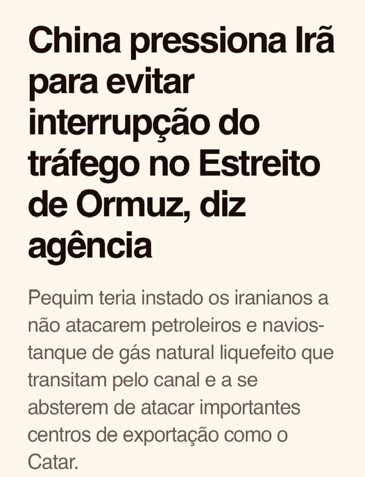 O portal de notícias iraniano “HispanTV”, voltado para as nações de língua espanhola, publicou nesse sábado (14/03) um importante artigo intitulado: “Incapaz diante do Irã, Trump recorre a ajuda da China para reabrir o Ormuz” em que afirma “Diante da incapacidade das Forças Armadas dos EUA de reabrir o Estreito de Ormuz, Trump recorreu à China e a outros países em busca de ajuda para manter a via navegável aberta”. O texto afirma declara: “Em uma publicação em sua rede social Truth, o presidente dos EUA, Donald Trump, afirmou neste sábado que ‘muitos países, especialmente aqueles afetados pela tentativa do Irã de fechar o Estreito de Ormuz, enviarão navios de guerra, em conjunto com os Estados Unidos, para manter o estreito aberto e seguro. Esperamos que a China, a França, o Japão, a Coreia do Sul, o Reino Unido e outros países afetados por essa restrição artificial enviem navios para a região, para que o Estreito de Ormuz deixe de ser uma ameaça”. Como podemos observar EUA e China atuam para que o Regime dos Aiatolás reabra a passagem marítima a fim de que o preço do óleo cru caia como defendem as corporações petrolíferas que integram a Governança Global do Capital Financeiro para que não sejam reféns da nação persa.